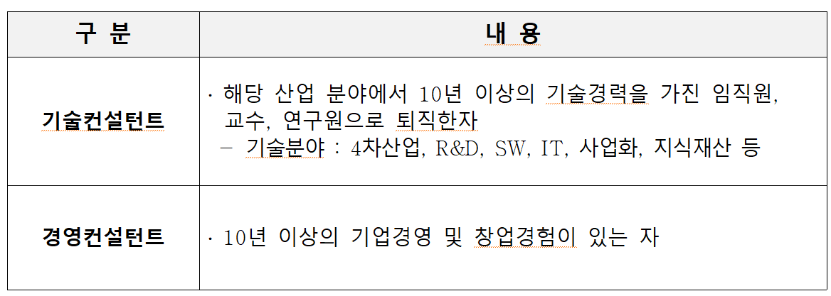* 사업의 특징 : 창업팀당 경영컨설턴트 1명 과 기술컨설턴트 1명을 매칭함