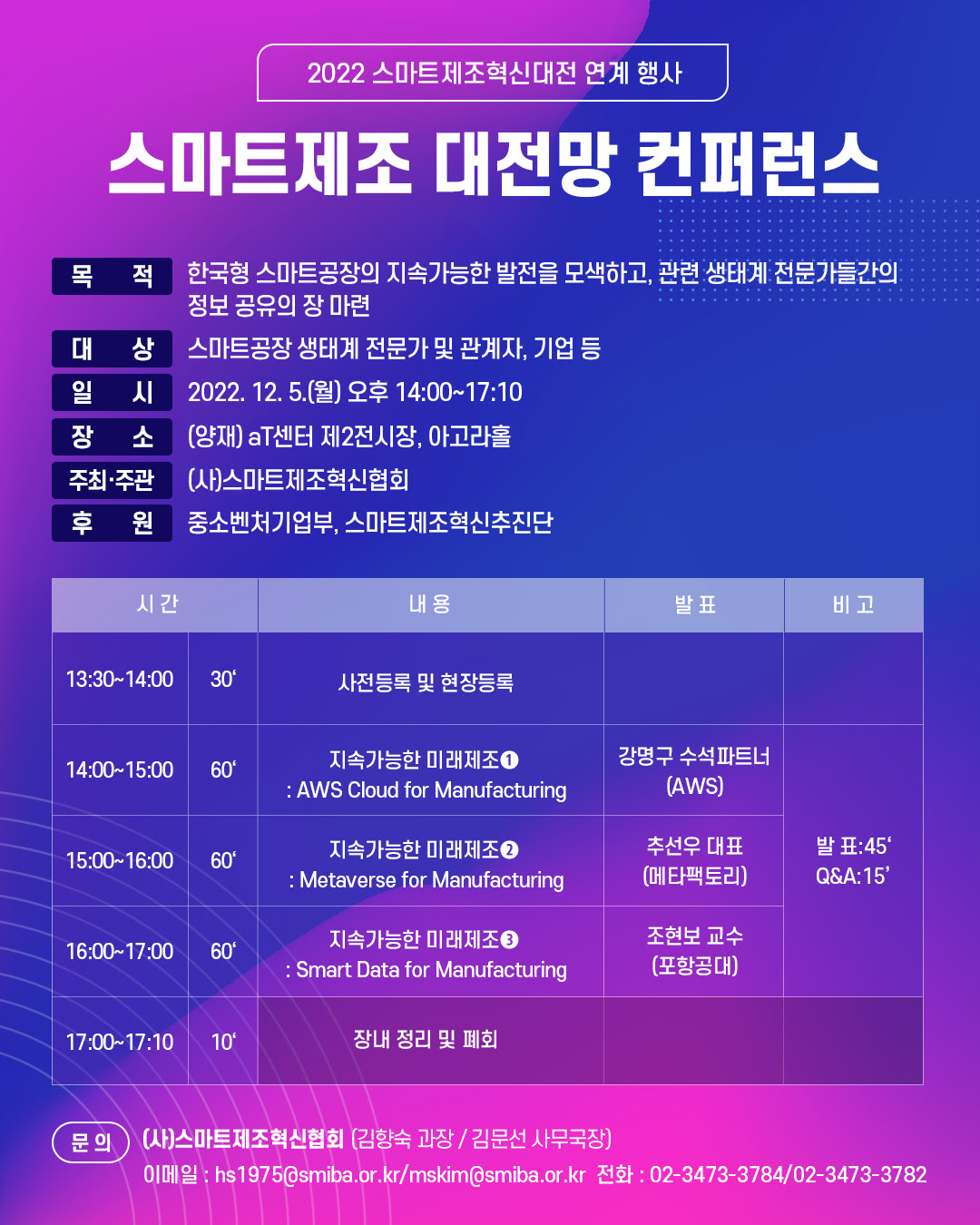 2022년 스마트제조혁신대전에서 8개의 키워드 주제를 만나보세요! 기간 : 2022.12.05(월) ~ 2022.12.7(수) 장소 : (양재) AT센터 제2 전시장 * 스마트제조 표준에 관심있어 Conference 5 '스마트제조 표준 교육' 에 저는 참석합니다. Conference 1. 스마트제조 대전망 Conference 2. ICT와 미래 스마트제조 혁신 Conference 3. 대중소 상생형 스마트공장 Conference 4. 스마트생산과 제조업의 미래 Conference 5. 스마트제조 표준 교육 (저는 이 세미나에 참여합니다.) Conference 6. 제조업의 미래, 스마트팩토리 기술과 사례 Conference 7. 스마트인재 포럼 Conference 8. 제조 디지털트윈
